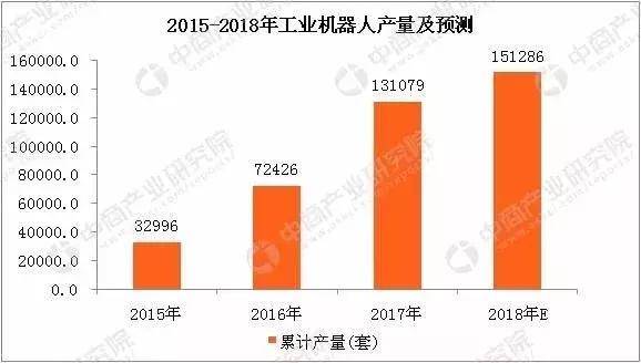 據中商產業研究院發布的《2018-2023年中國工業機器人市場前景及投資機會研究報告》,數據顯示,2017全年中國工業機器人產量達到131079套,預計2018年工業機器人產量將達到151286套。