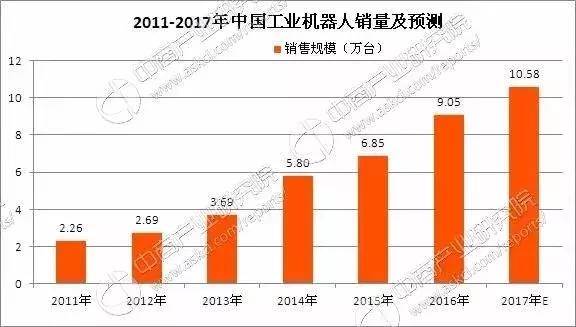 報告顯示,2011年-2016年中國工業機器人銷量年均復合增長率為32.1%,預計2017年中國工業機器人銷量約10.58臺,同比增長16.9%。